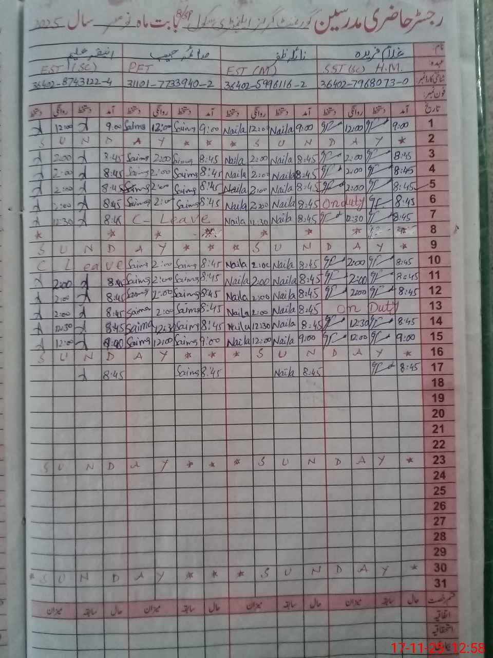 | Name: Gh**** Fa**** Designation: (School Headmaster's/Headmistress's) SST Science Phone/Cell Number: 03**** |
