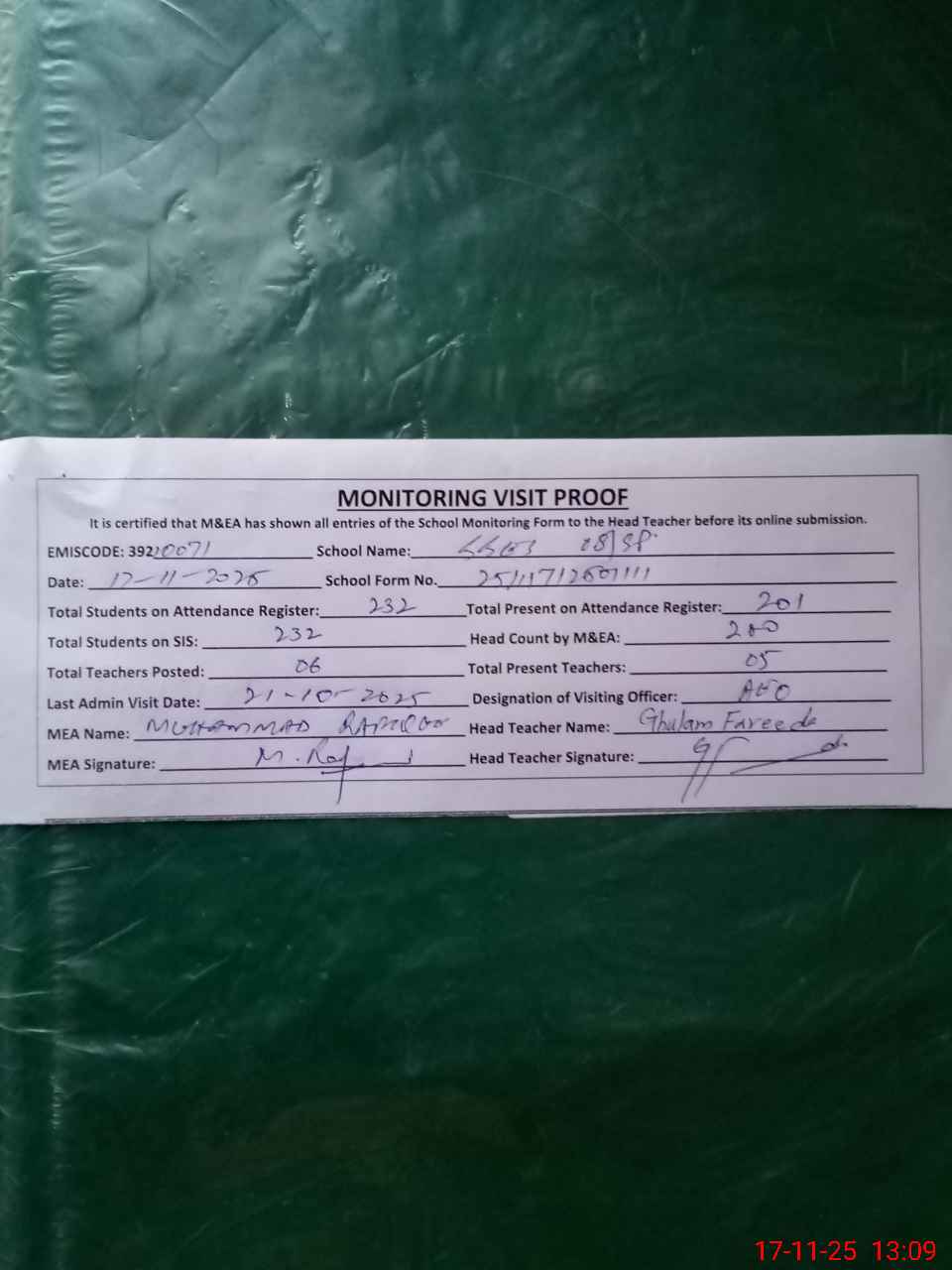 | Attendance Register | Head Teacher | MEA with School | Visit Proof |