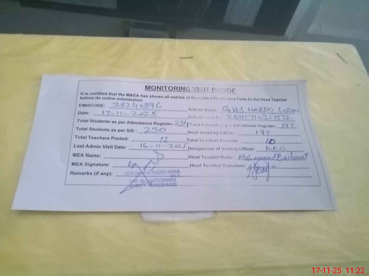 | Remarks (Use Separate Page if Required): Students on SIS QTY 230 Last admin visit On 16 November 2025 by AEO | |||||