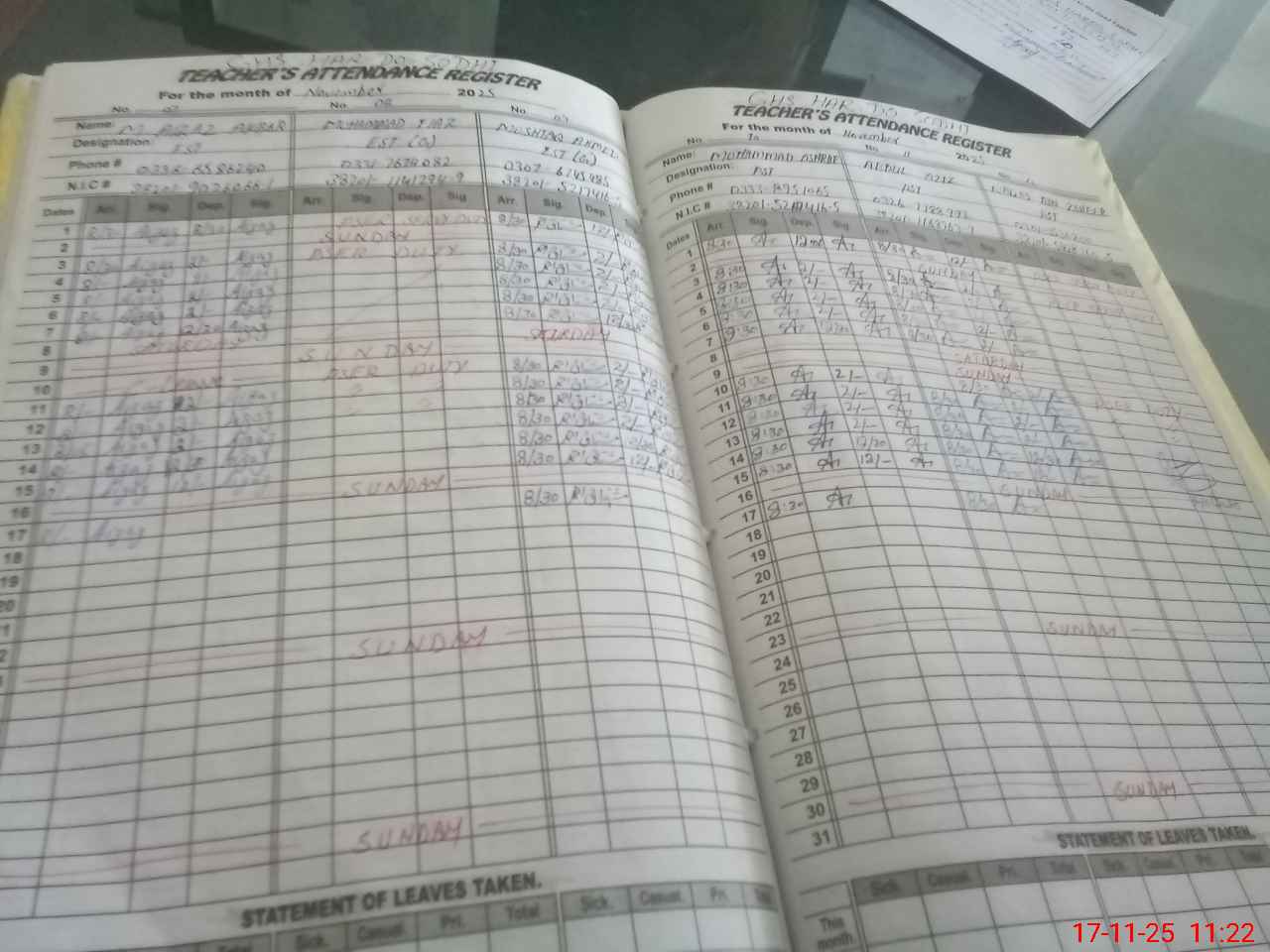 | CNIC | Full Name | Designation | R/C | Absence during last cal. month |