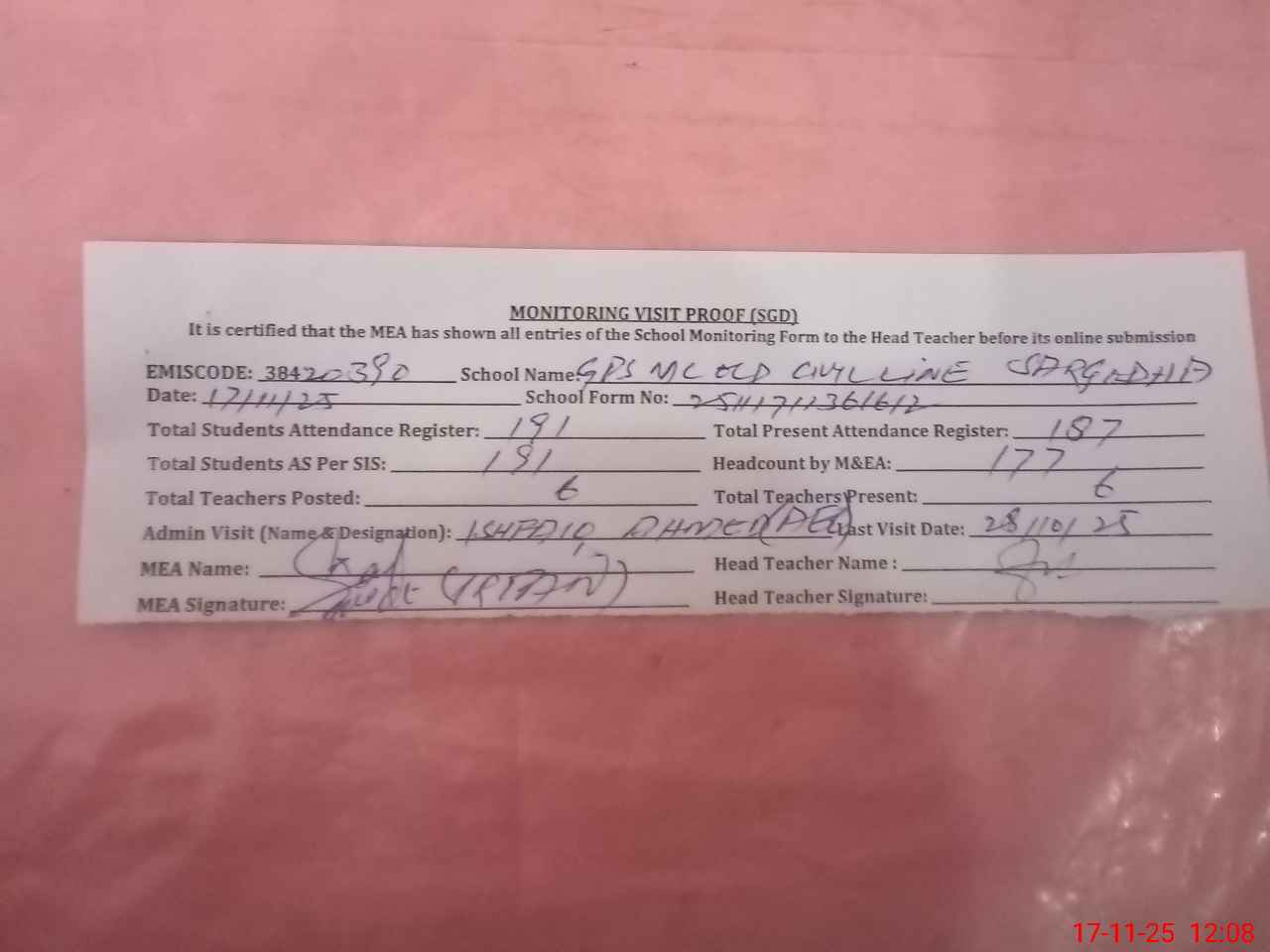 | Attendance Register | Head Teacher | MEA with School | Visit Proof |