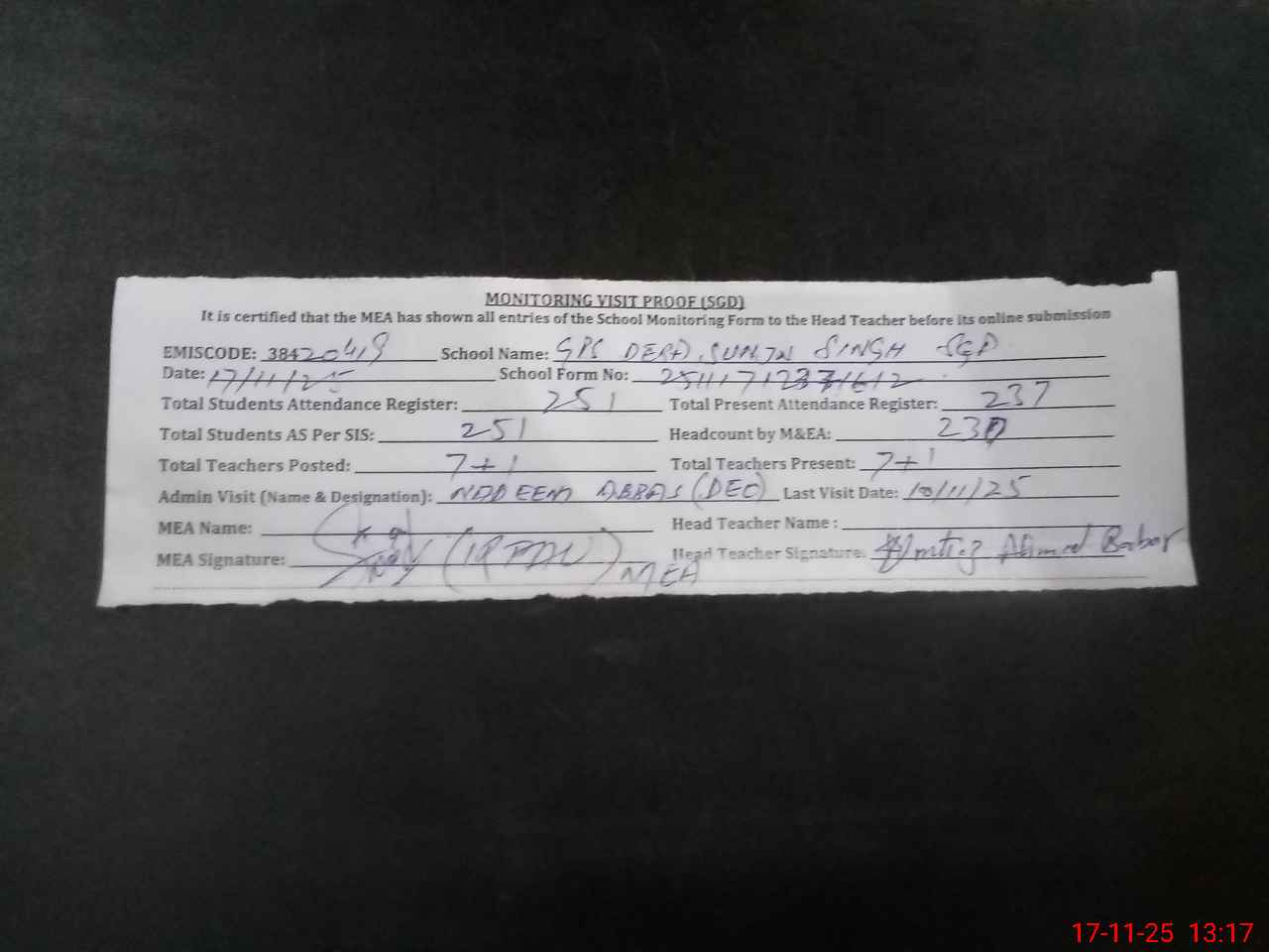 | Attendance Register | Head Teacher | MEA with School | Visit Proof |