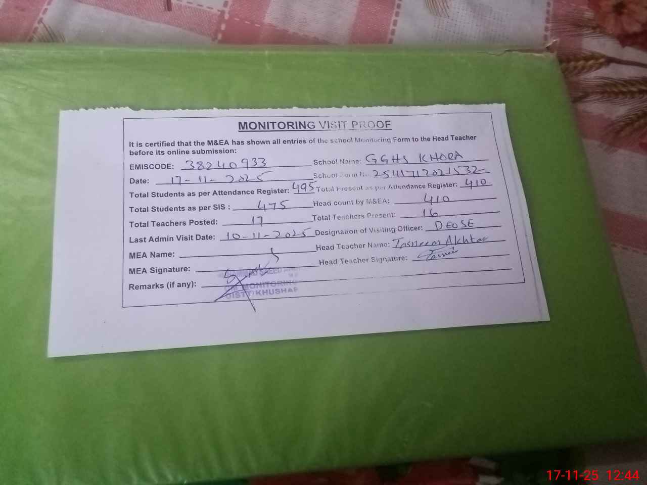 | Remarks (Use Separate Page if Required): Students on SIS QTY 475 Last admin visit On 10 November 2025 by DEO SE | |||||