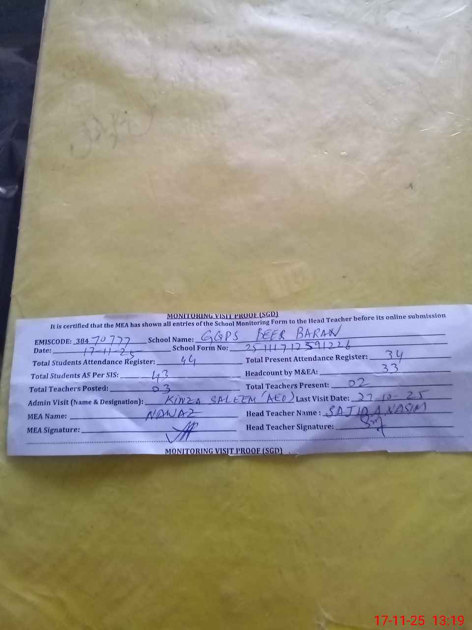 | Attendance Register | Head Teacher | MEA with School | Visit Proof |