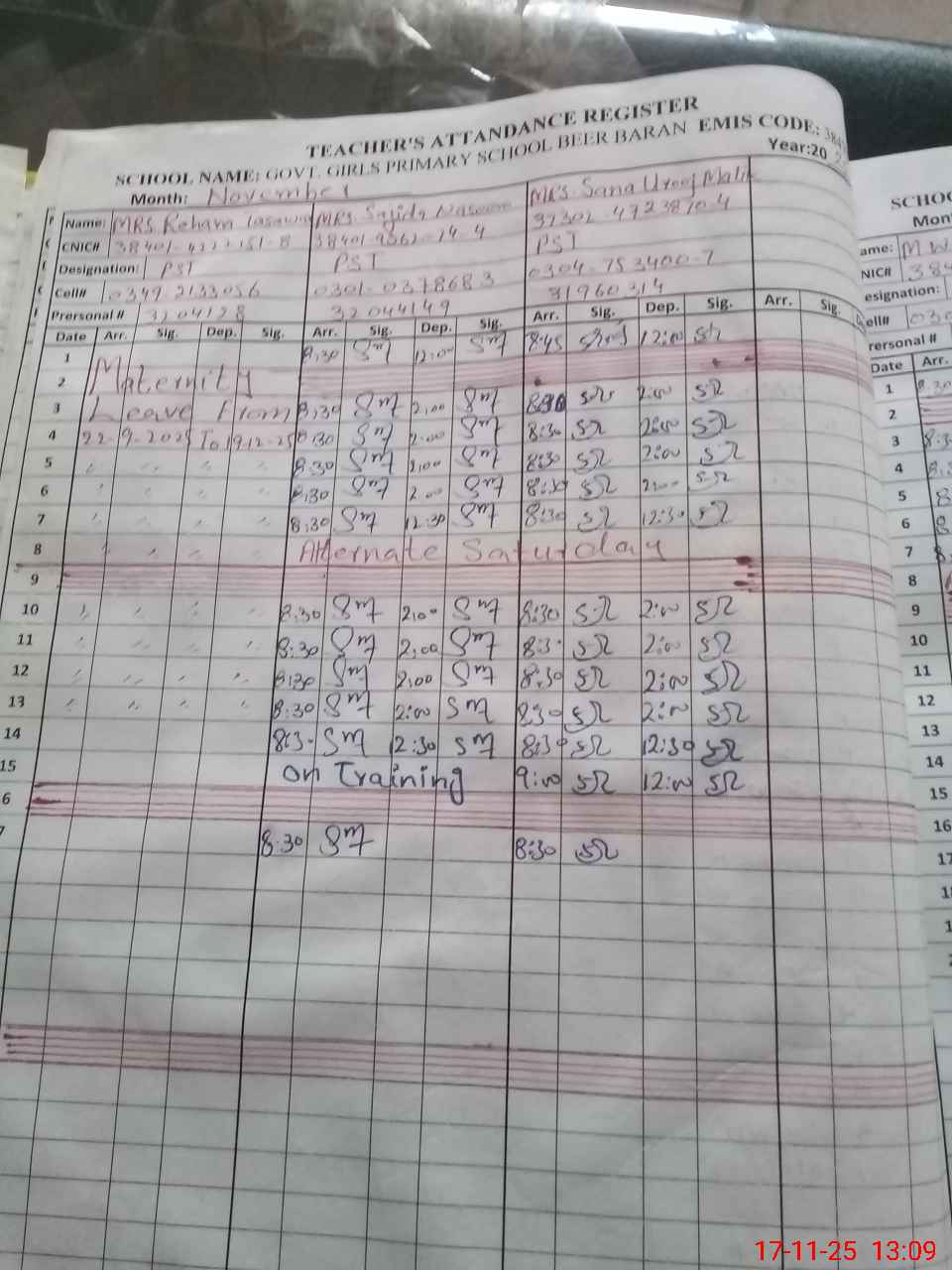 | CNIC | Full Name | Designation | R/C | Absence during last cal. month |