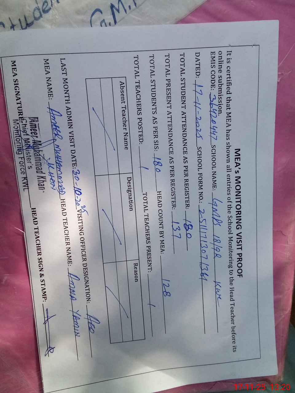 | EMIS Code: 36420447 | Name of School: GMPS 18/9-R, KACHA KHUH | |||
