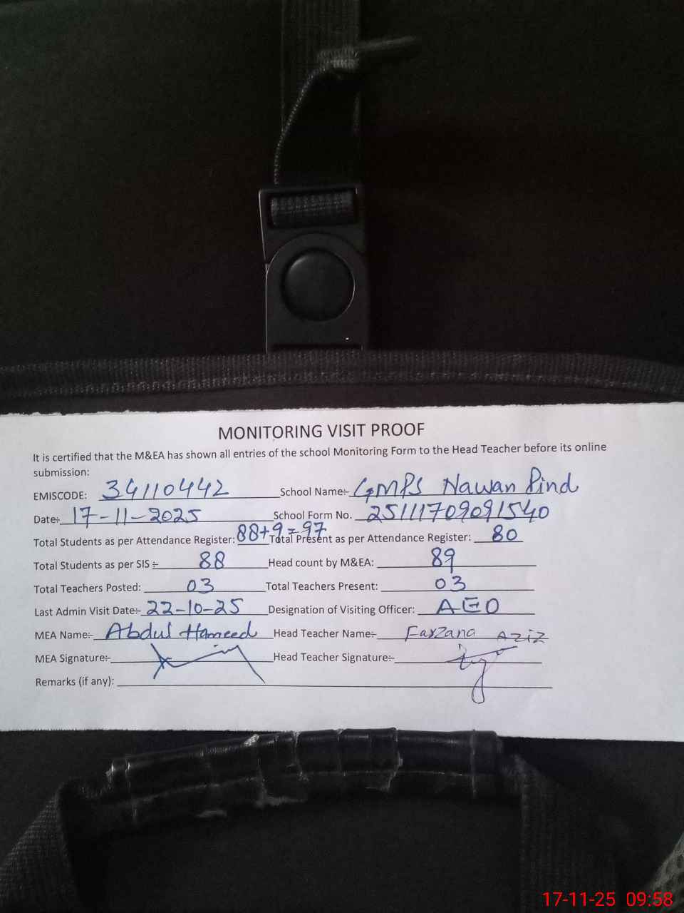 | Attendance Register | Head Teacher | MEA with School | Visit Proof |