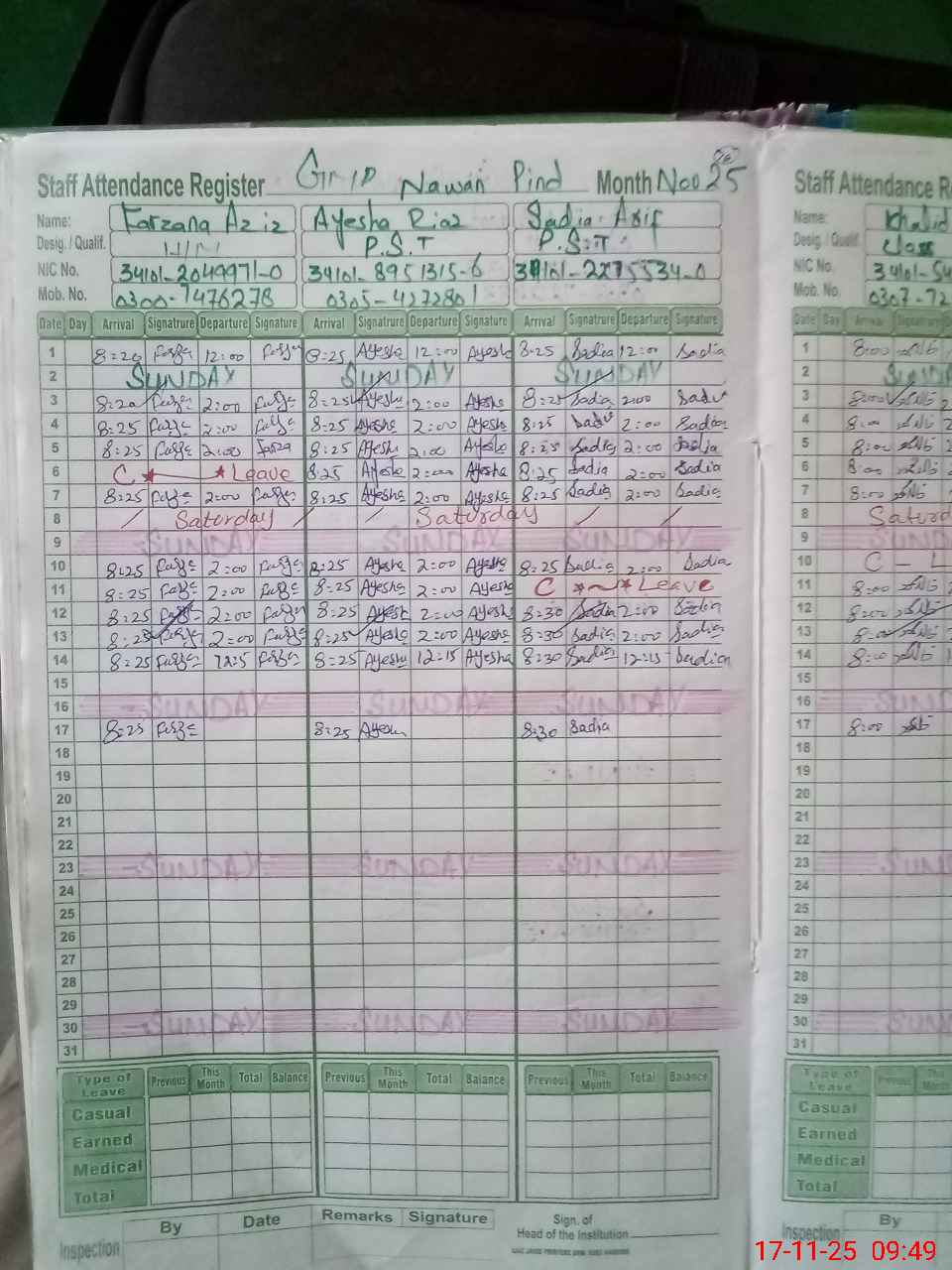 | CNIC | Full Name | Designation | R/C | Absence During Last Calender Month |