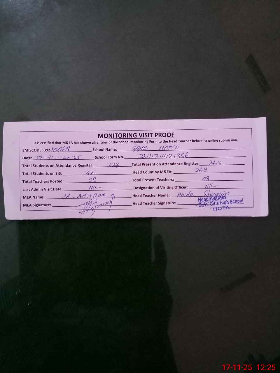 | Attendance Register | Head Teacher | MEA with School | Visit Proof |