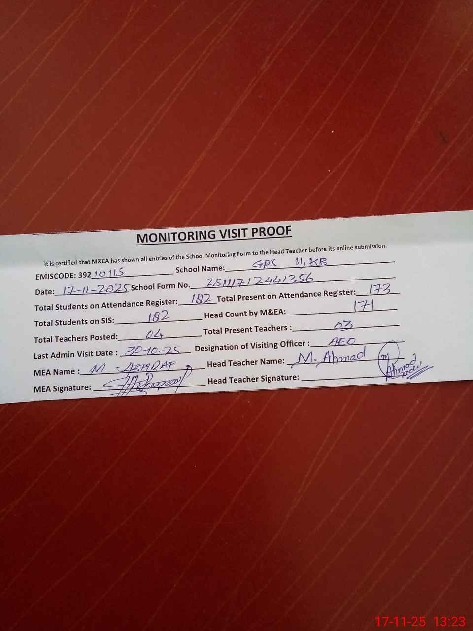 | Attendance Register | Head Teacher | MEA with School | Visit Proof |