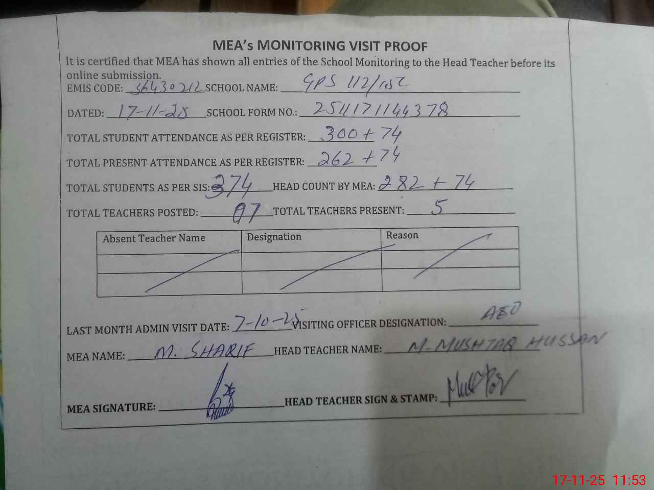 | Attendance Register | Head Teacher | MEA with School | Visit Proof |