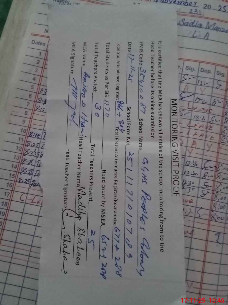 | Attendance Register | Head Teacher | MEA with School | Visit Proof |