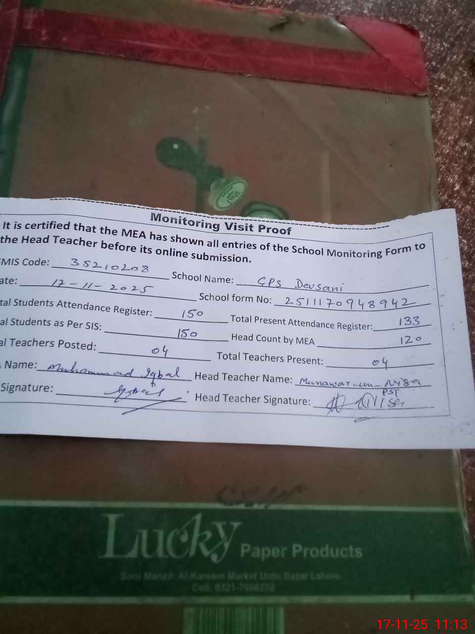 | Attendance Register | Head Teacher | MEA with School | Visit Proof |