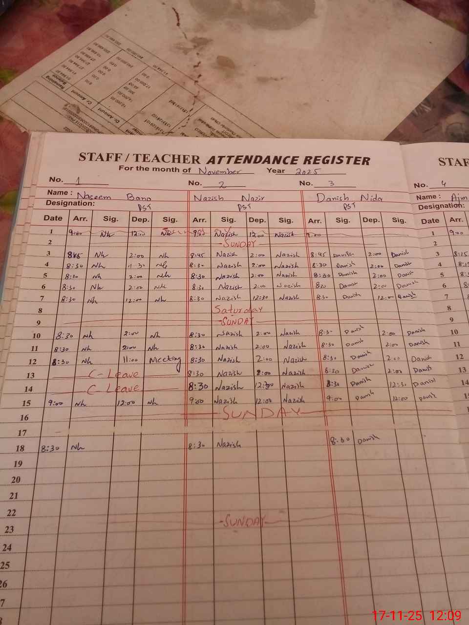 | CNIC | Full Name | Designation | R/C | Absence During Last Calender Month |