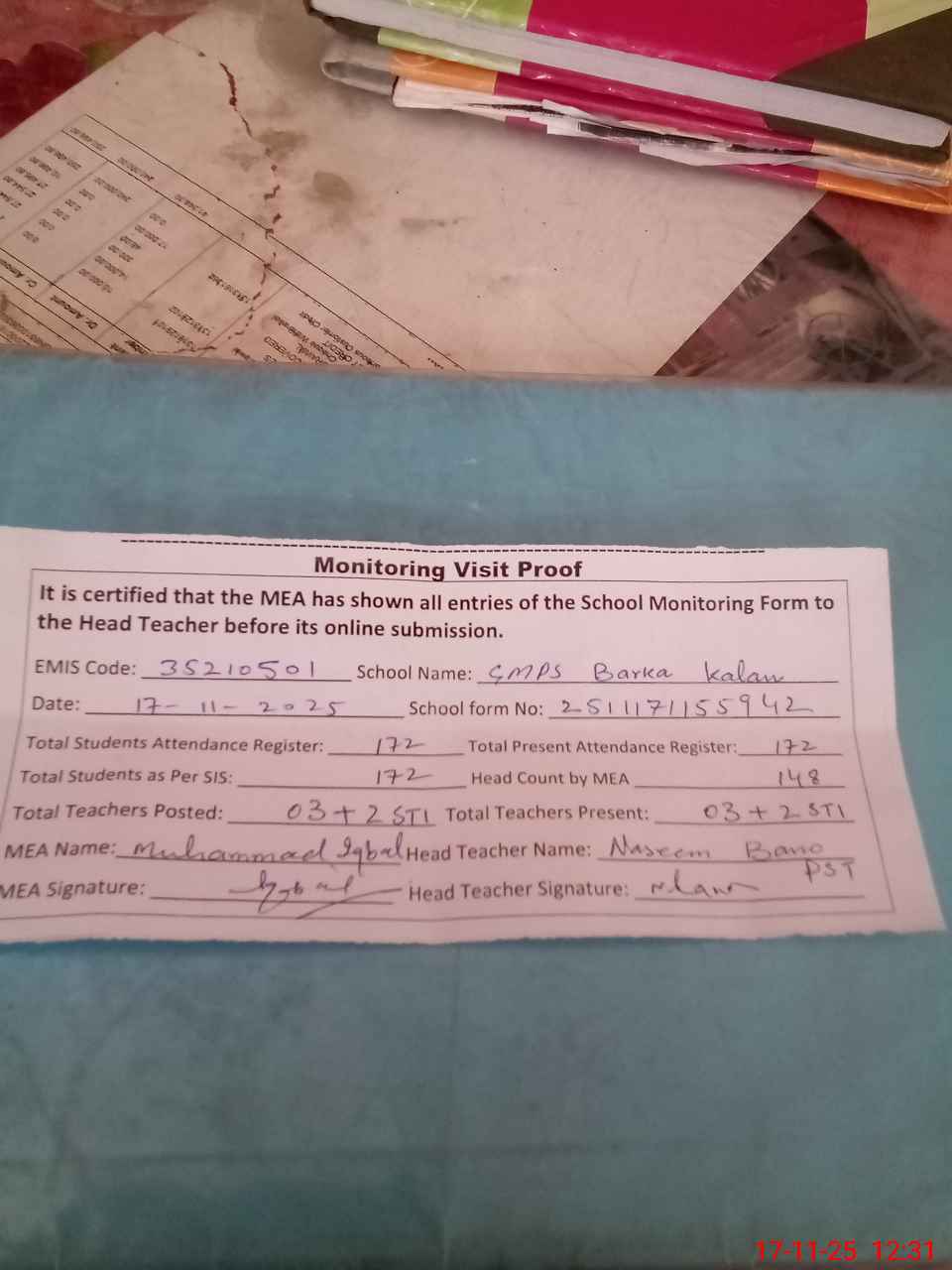 | Attendance Register | Head Teacher | MEA with School | Visit Proof |