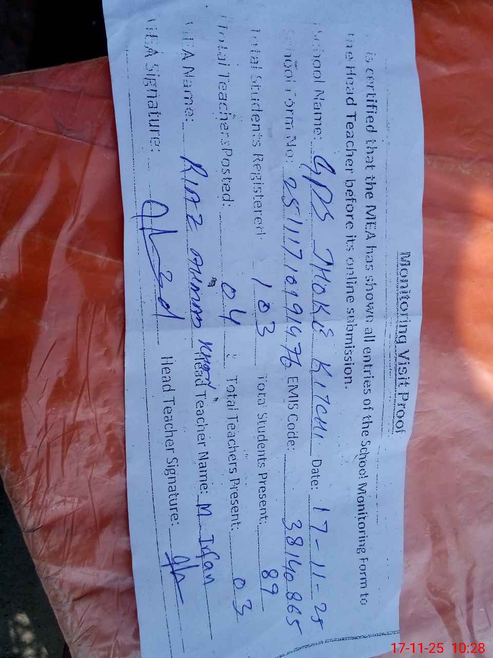 | Attendance Register | Head Teacher | MEA with School | Visit Proof |