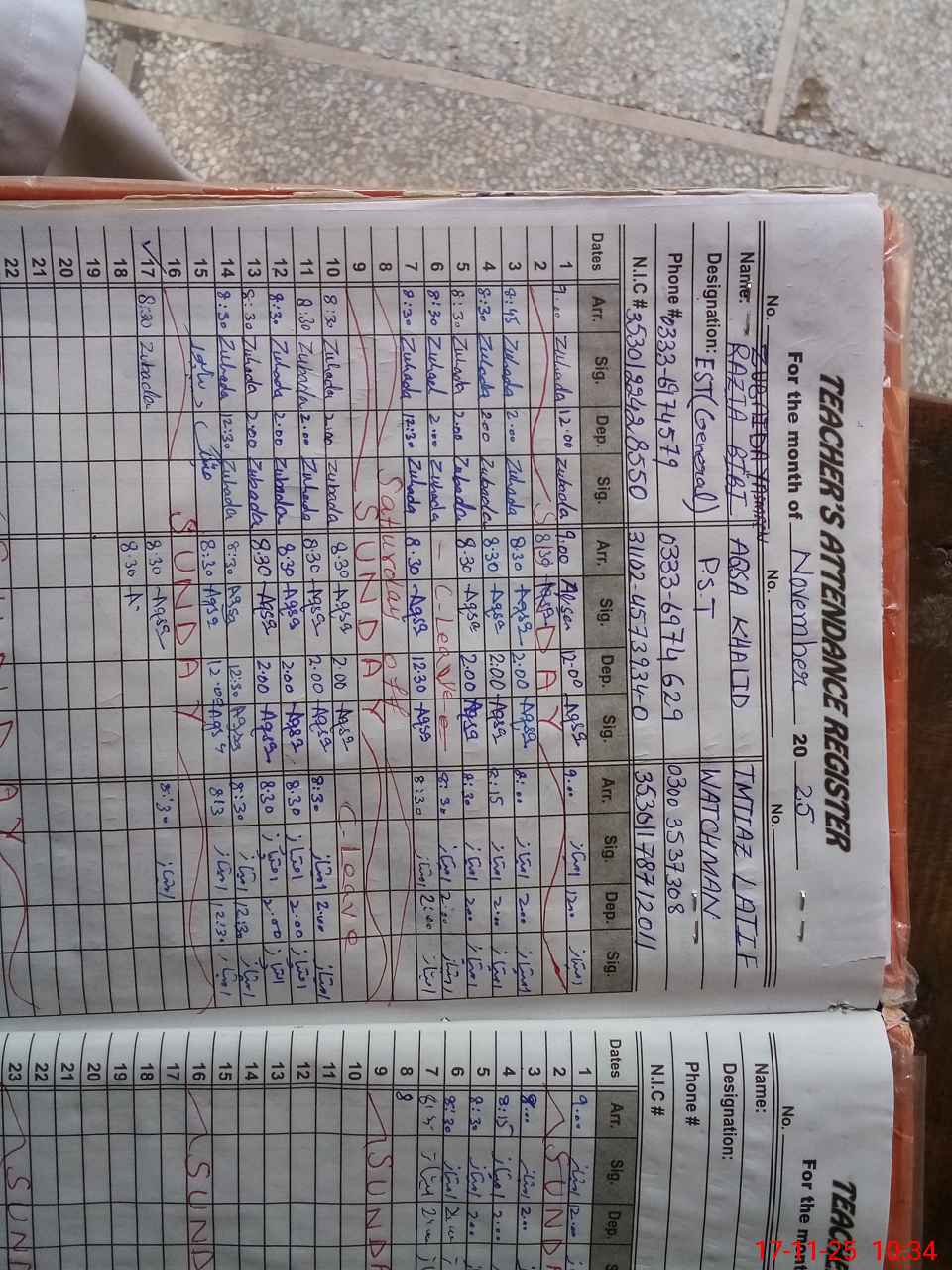 | CNIC | Full Name | Designation | R/C | Absence During Last Calender Month |