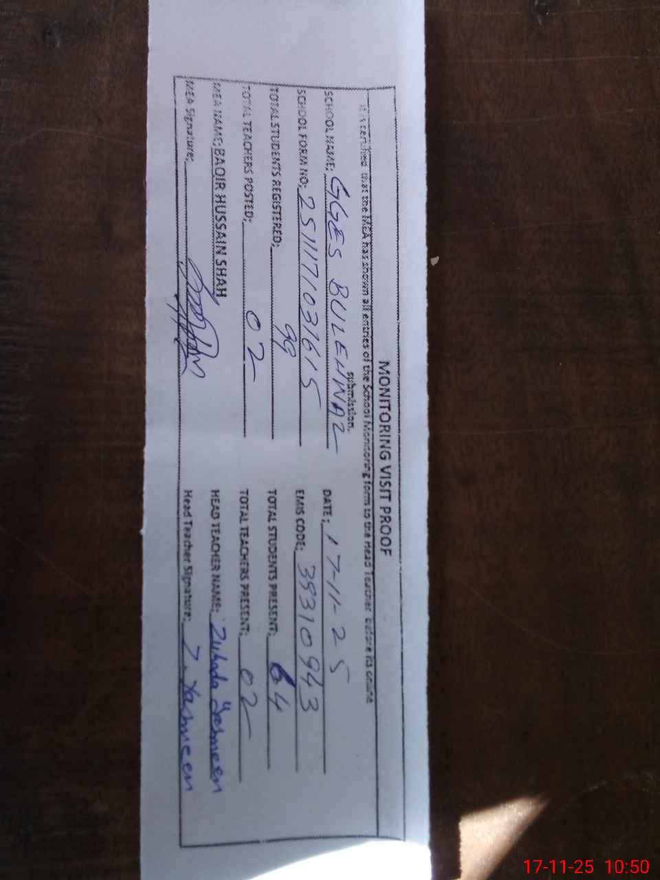 | Attendance Register | Head Teacher | MEA with School | Visit Proof |