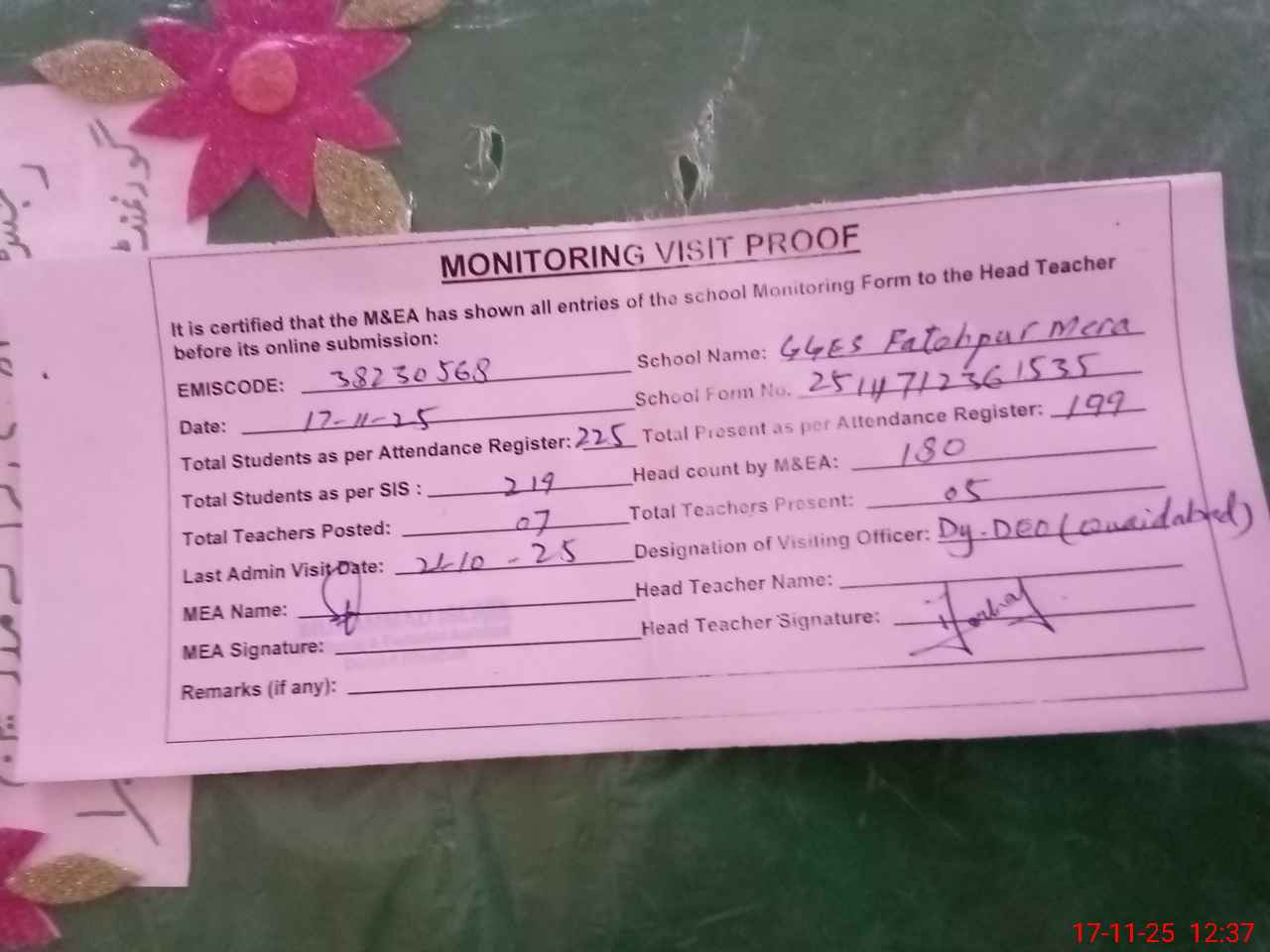 | Remarks (Use Separate Page if Required): Dy DEO visited school on 21 October 2025 Students strength on sis 219 School has no administration no one own responsibility of headship School NSB and FTF register not available in my 2nd visit Teacher not know book record register 2 toilets blocked School has no AEO | |||||