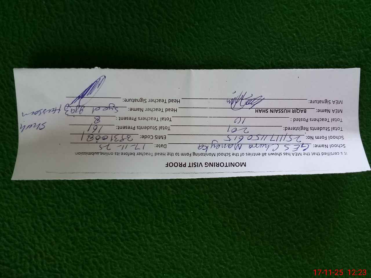 | Attendance Register | Head Teacher | MEA with School | Visit Proof |