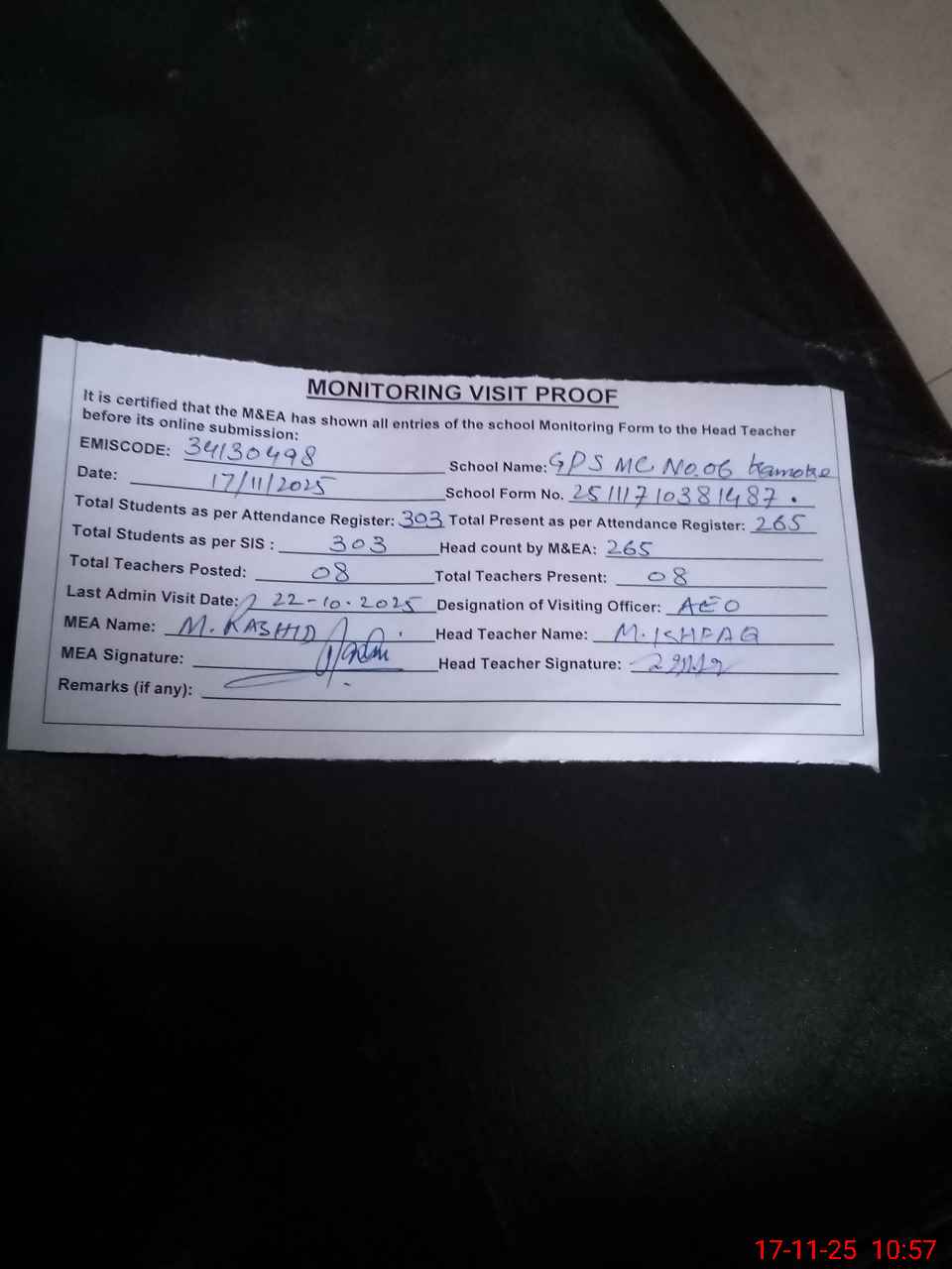 | Attendance Register | Head Teacher | MEA with School | Visit Proof |