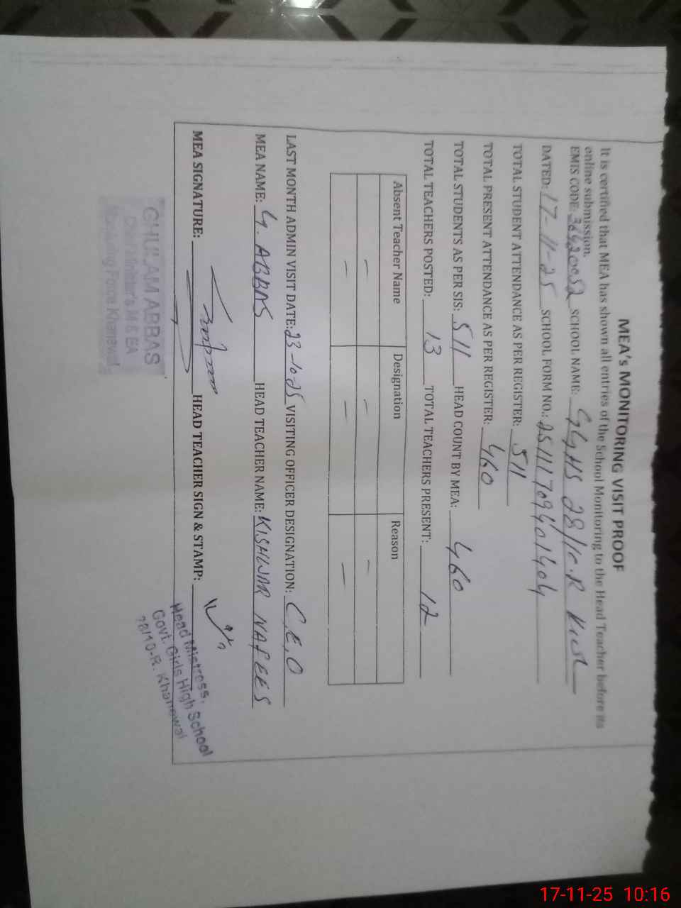 | Attendance Register | Head Teacher | MEA with School | Visit Proof |
