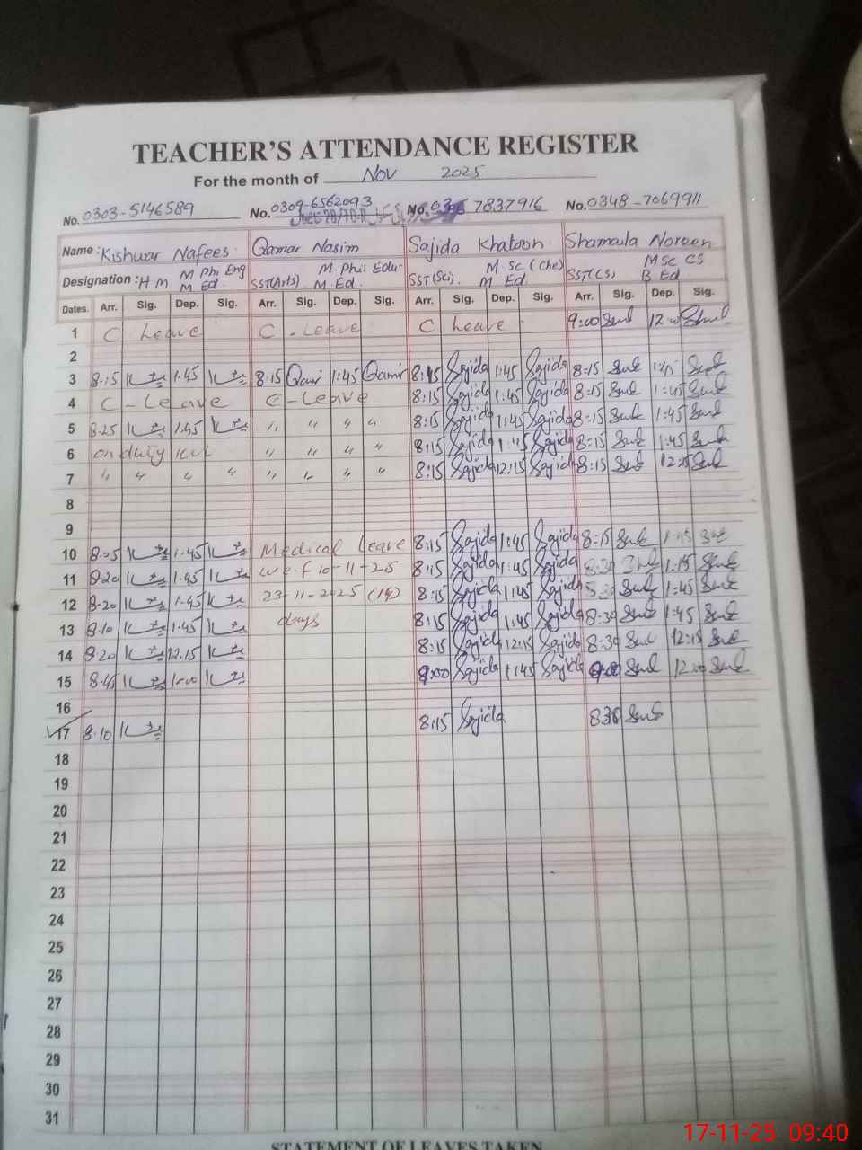 | CNIC | Full Name | Designation | R/C | Absence During Last Calender Month |