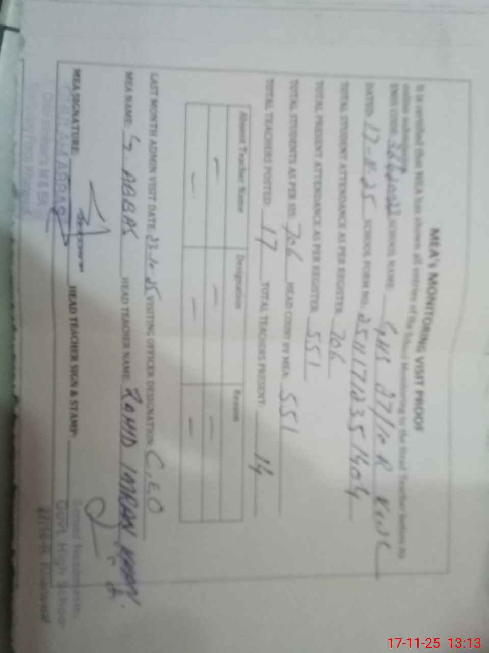 | Certified that this School was Inspected by the Undersigned MEA/DMO Today and the Information Stated Above is as Per Record. | |||||