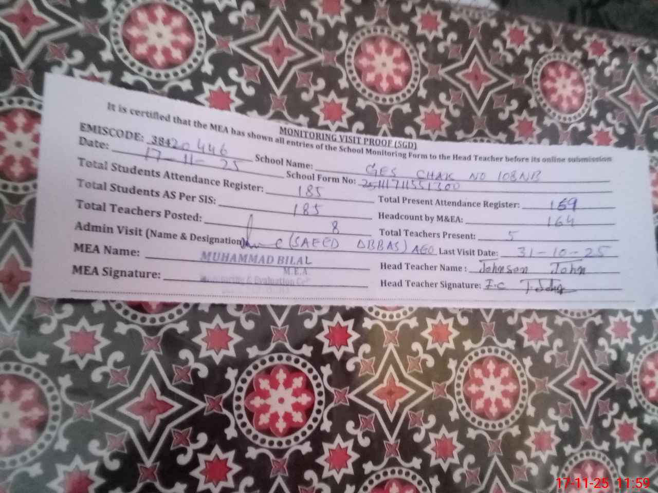 | EMIS Code: 38420446 | Name of School: GES CHAK NO.108 NB | |||