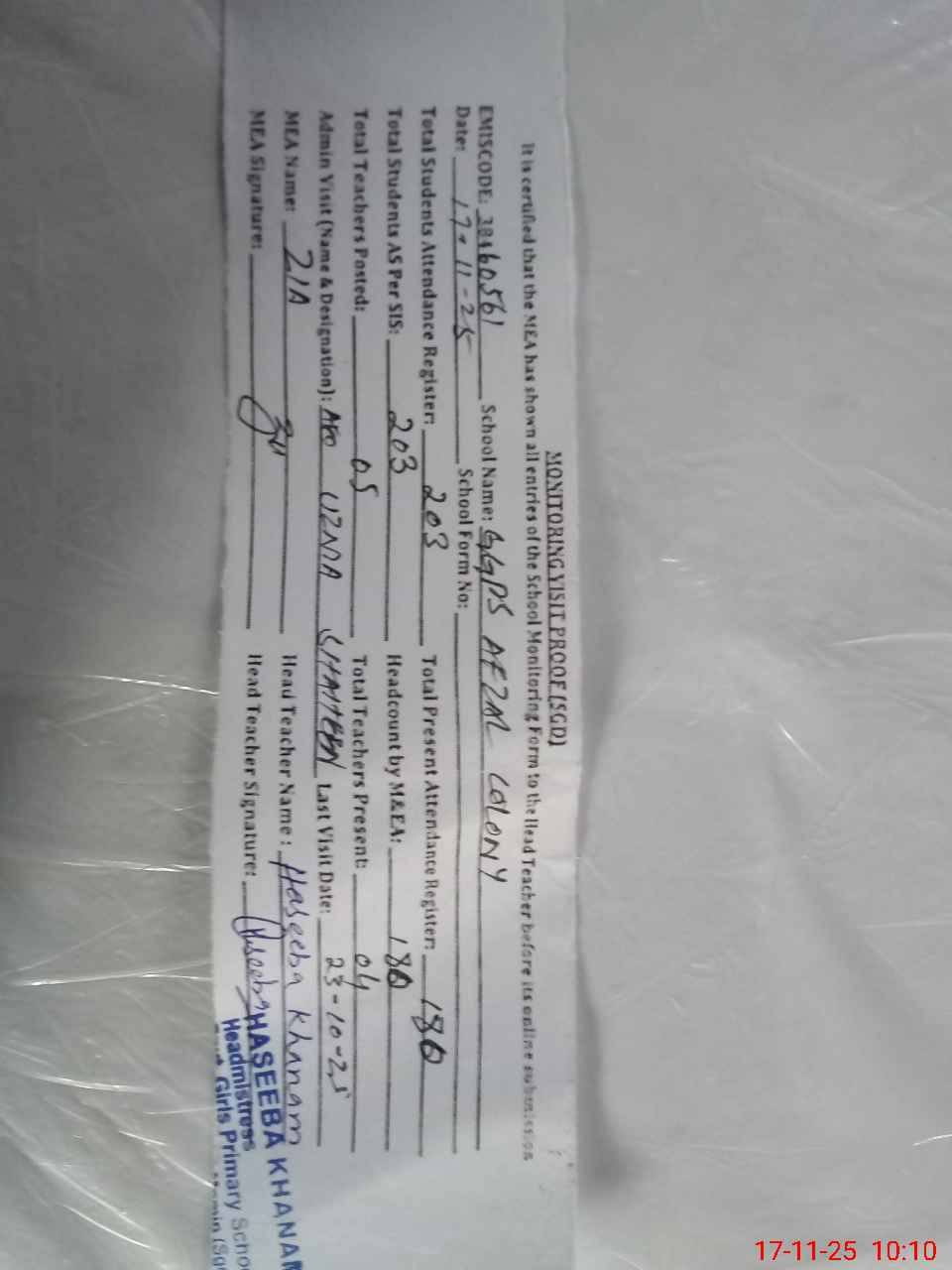 | Monitoring Date: 17-11-2025 | Start Time: 17-11-2025 09:35 AM | End Time: 17-11-2025 10:11 AM | Name of MEA: ZI**** ULHA**** | |