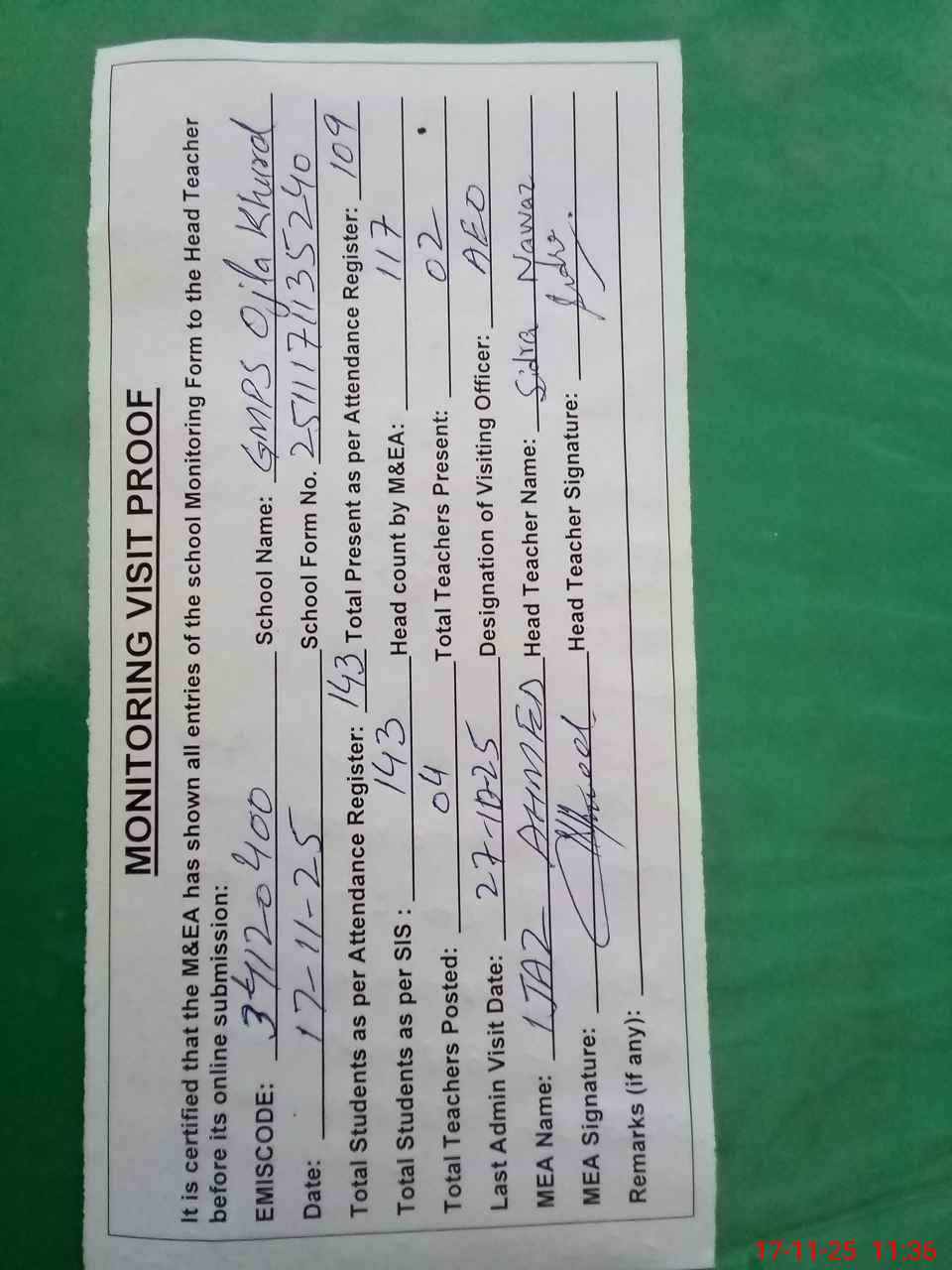 | Attendance Register | Head Teacher | MEA with School | Visit Proof |