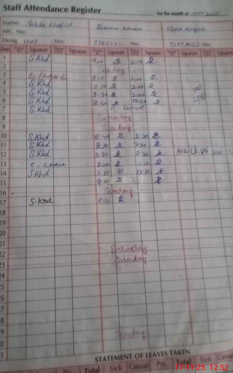 | Remarks (Use Separate Page if Required): 01 teacher named ZOYA EST is long absent since 11 Jan 2025 and other teacher named Saima Nasreen is absent today due to leave record is not available | |||||