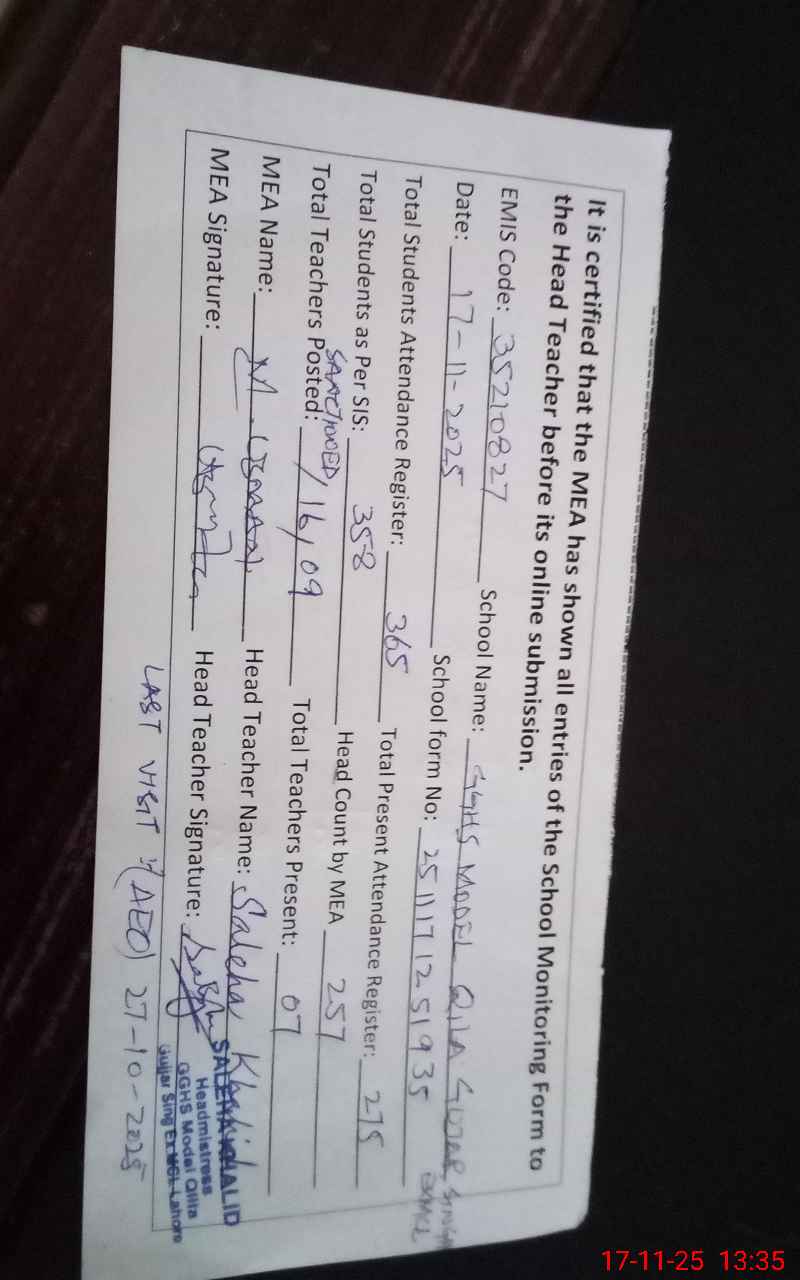 | EMIS Code: 35210827 | Name of School: GGHS MODEL QILA GUJAR SINGH (EX-MCL) | |||