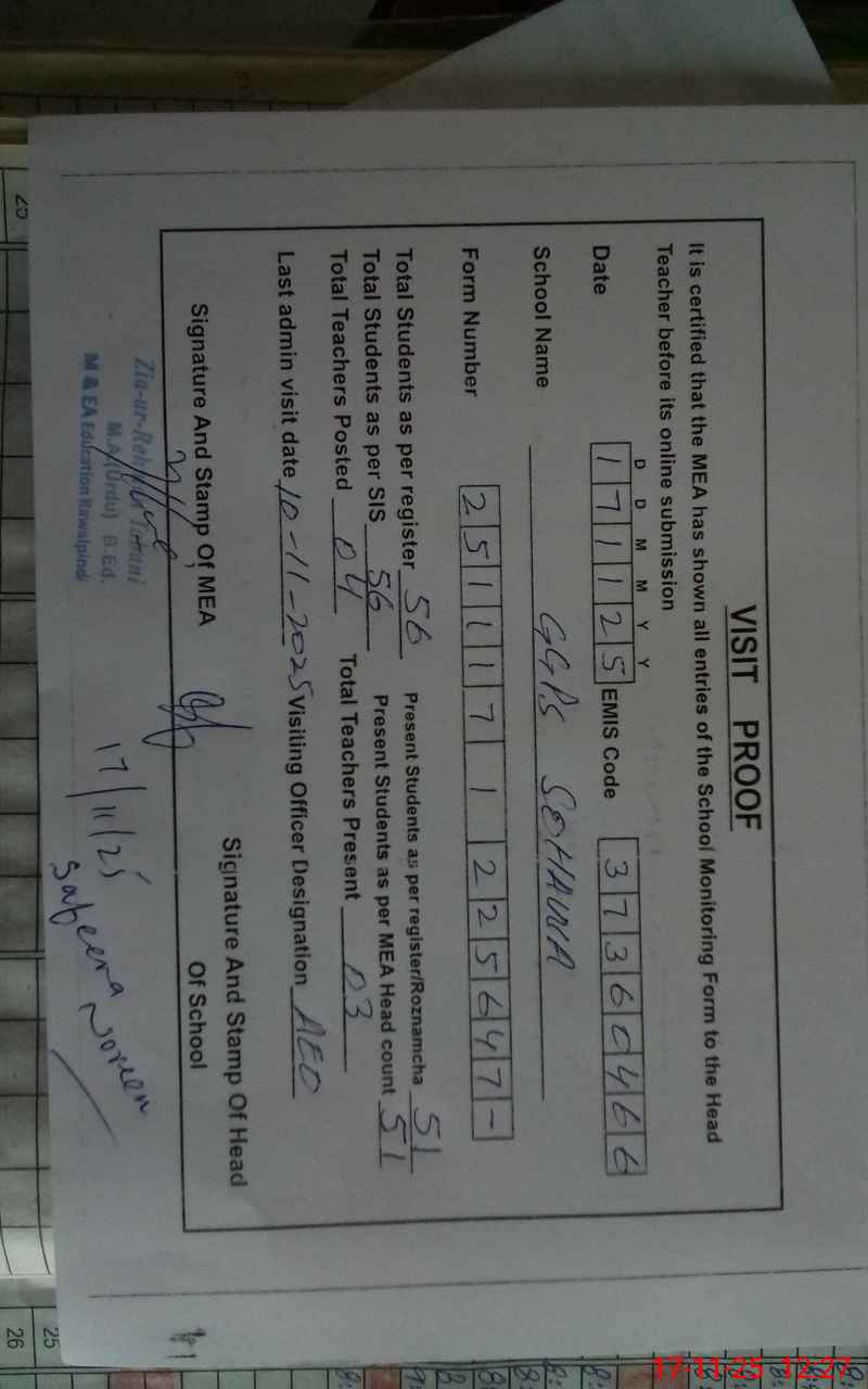 | Certified that this School was Inspected by the Undersigned MEA/DMO Today and the Information Stated Above is as Per Record. | |||||