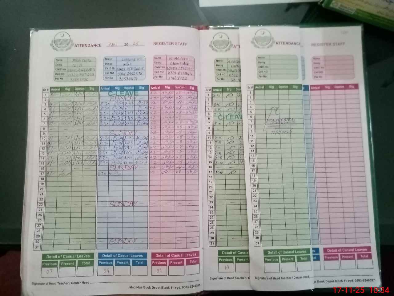 | CNIC | Full Name | Designation | R/C | Absence During Last Calender Month |