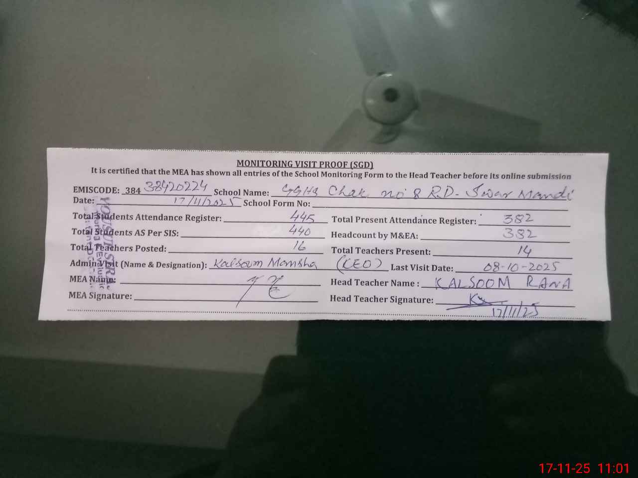 | Attendance Register | Head Teacher | MEA with School | Visit Proof |