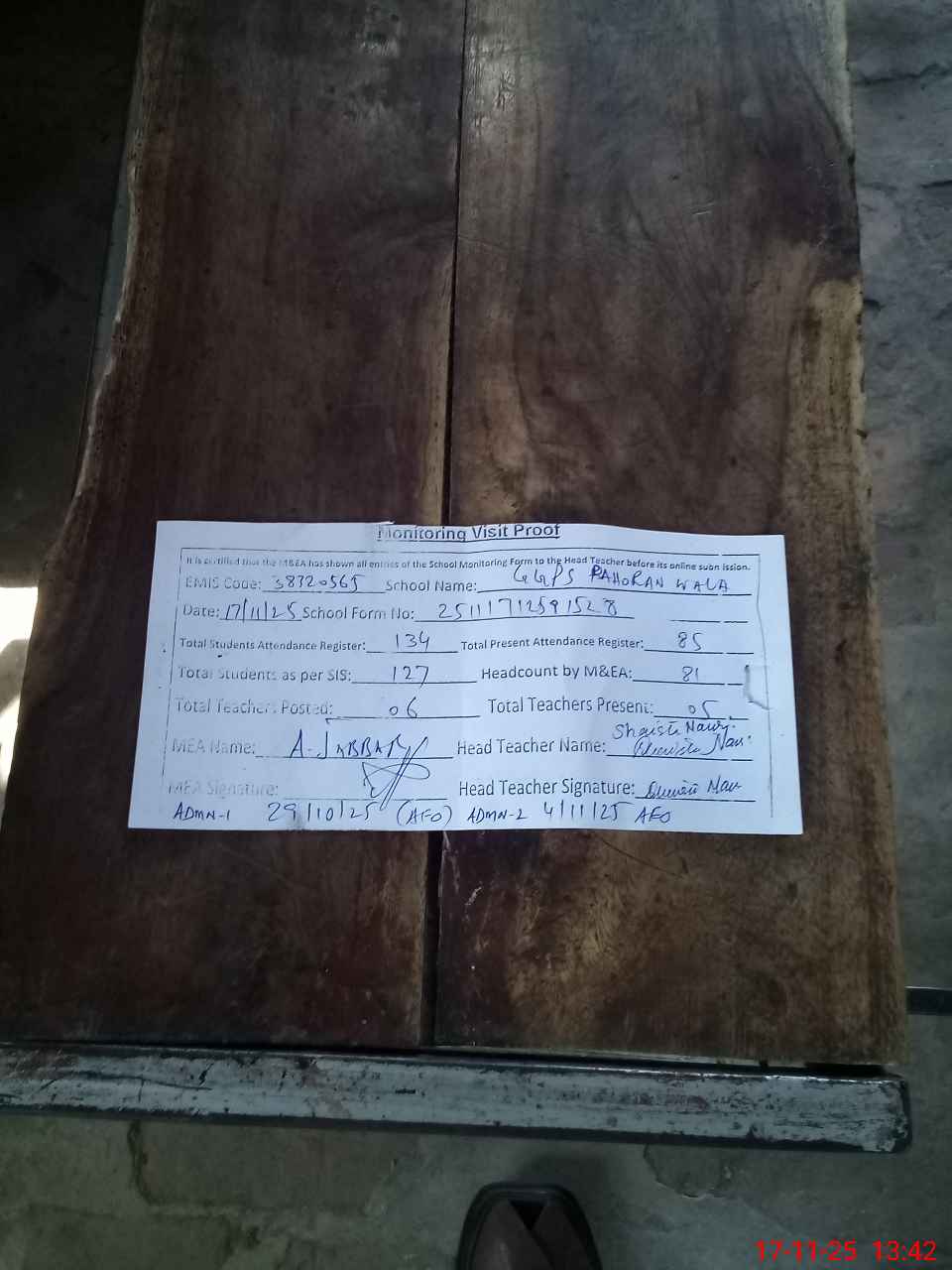 | Attendance Register | Head Teacher | MEA with School | Visit Proof |