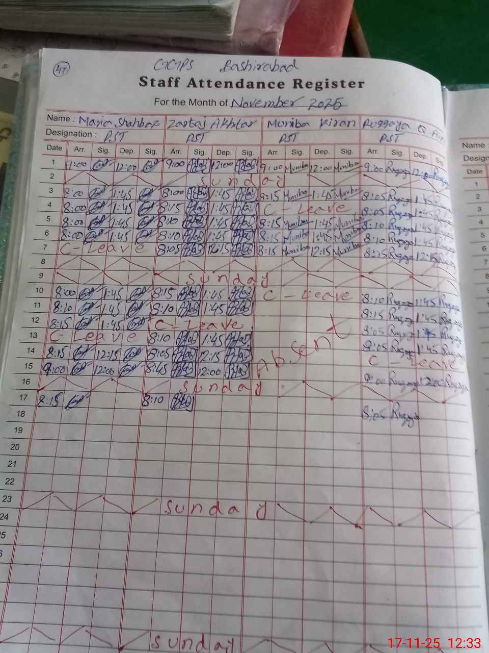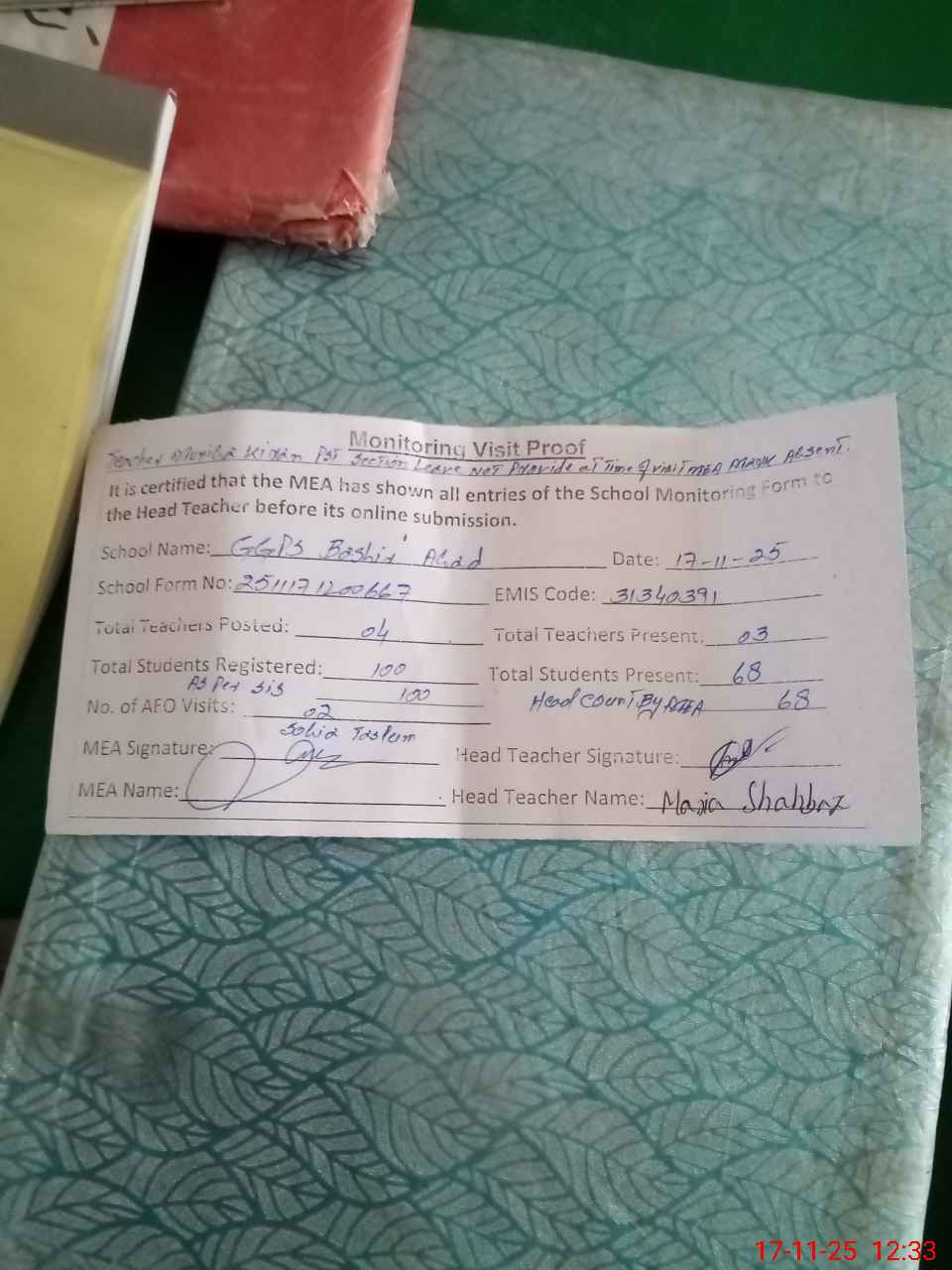 | Remarks (Use Separate Page if Required): Teacher Muniba Kiran PST section leave not provide at Time of visit mea Mark Absent Teacher Muniba Kiran Absent from 11 11 25 Frount camera is trouble | |||||