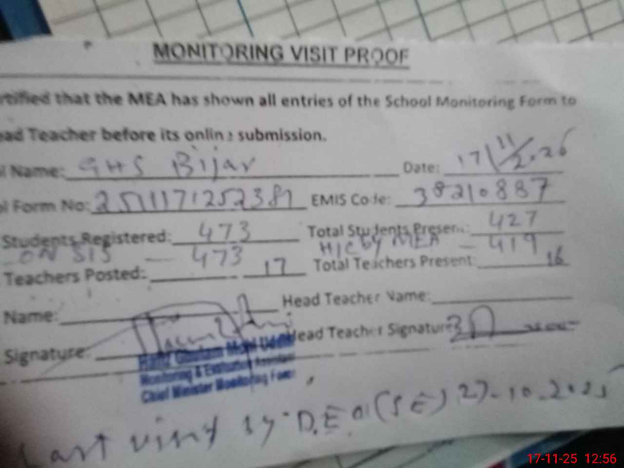 | EMIS Code: 38210887 | Name of School: GHS BIJAR | |||