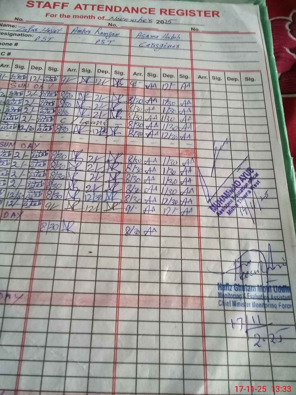 | CNIC | Full Name | Designation | R/C | Absence during last cal. month |