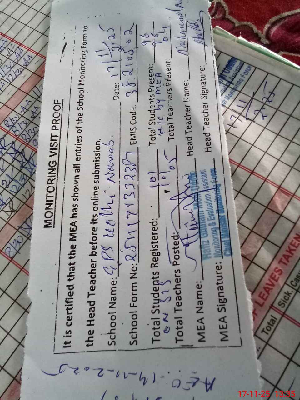 | Attendance Register | Head Teacher | MEA with School | Visit Proof |