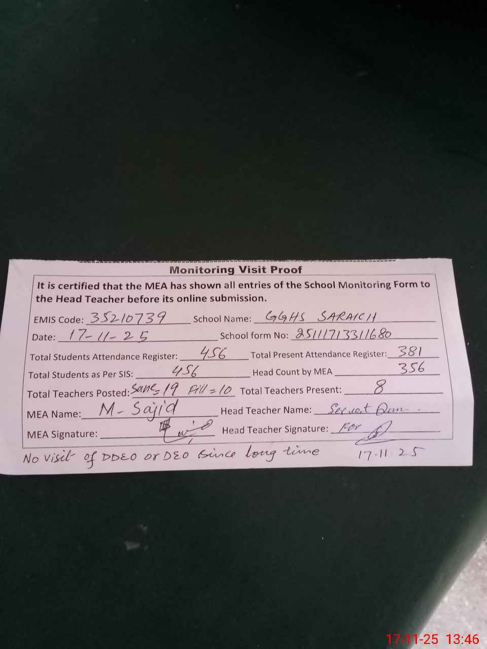 | Attendance Register | Head Teacher | MEA with School | Visit Proof |