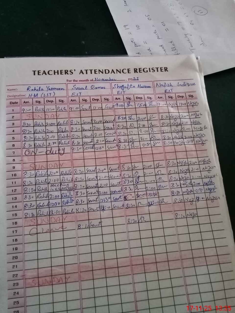 | CNIC | Full Name | Designation | R/C | Absence During Last Calender Month |