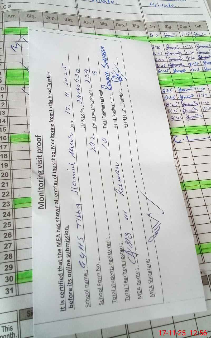 | Attendance Register | Head Teacher | MEA with School | Visit Proof |