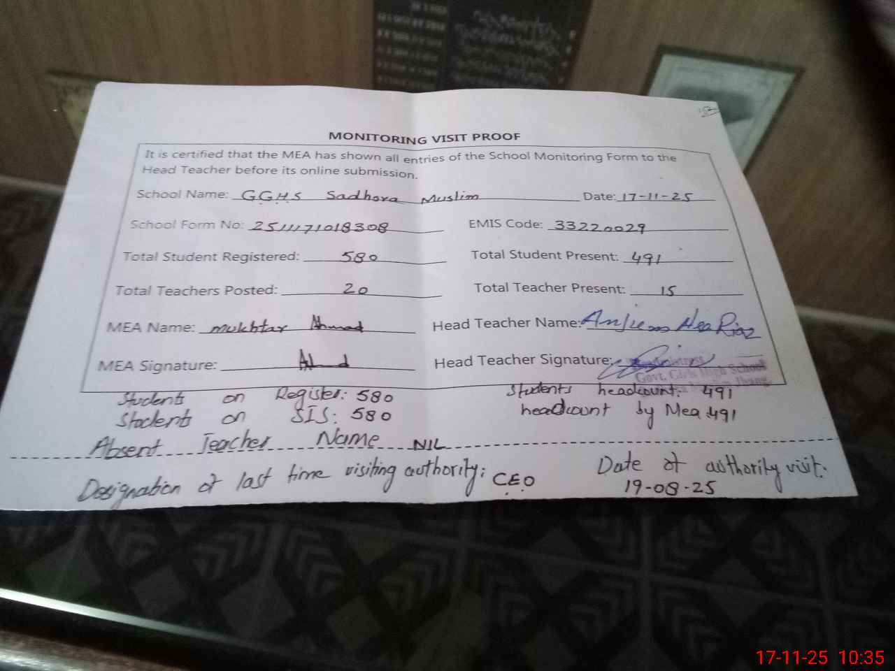 | EMIS Code: 33220029 | Name of School: GGHS SADHORA MUSLIM | |||