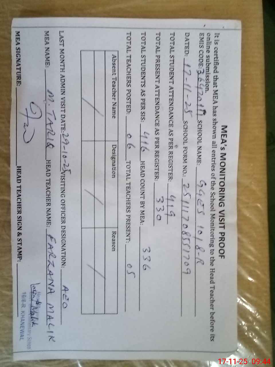 | Certified that this School was Inspected by the Undersigned MEA/DMO Today and the Information Stated Above is as Per Record. | |||||