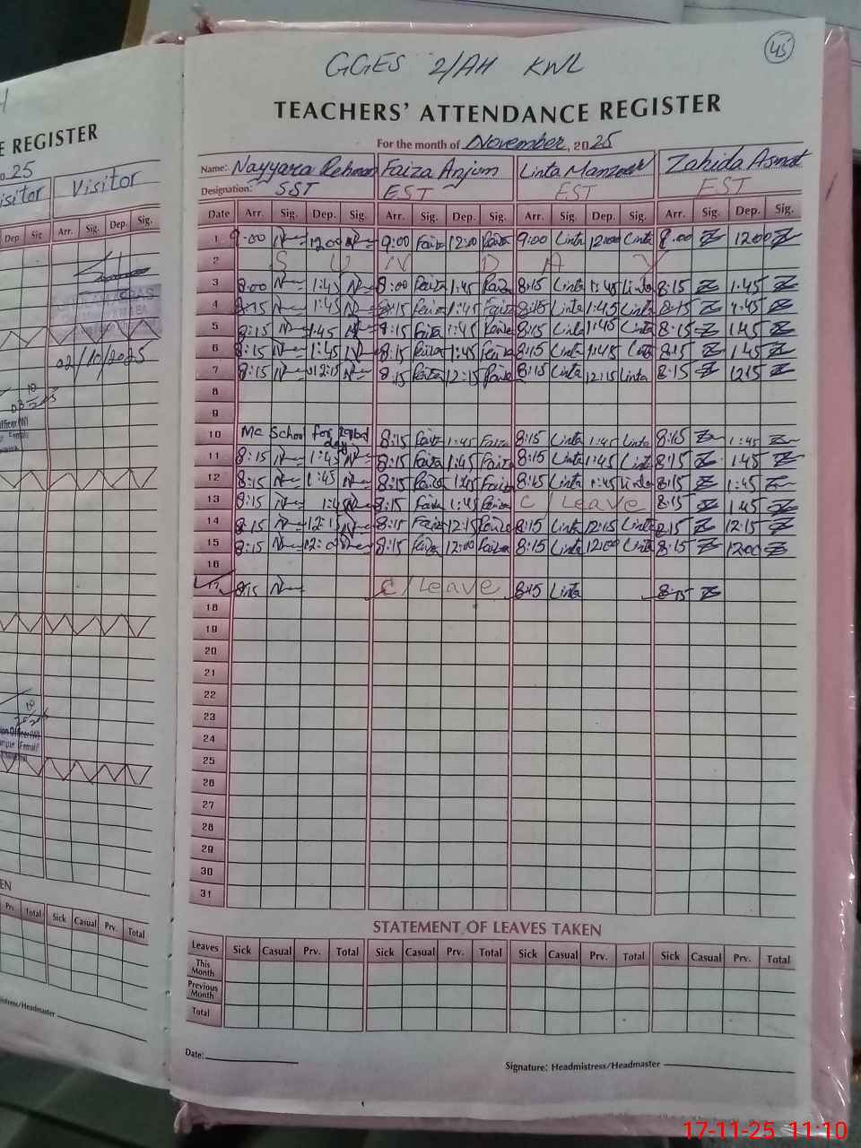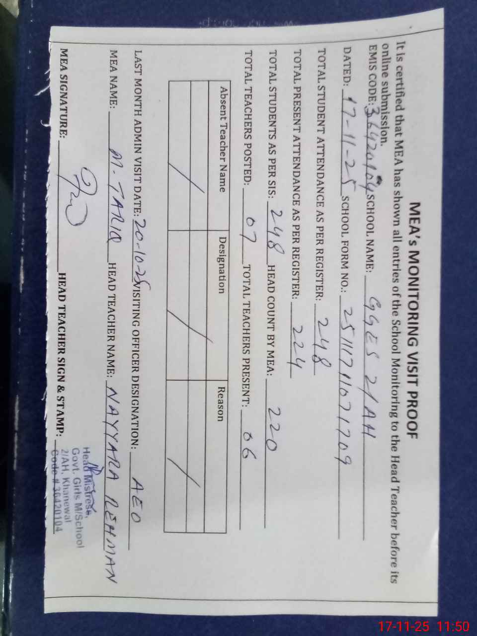 | Attendance Register | Head Teacher | MEA with School | Visit Proof |
