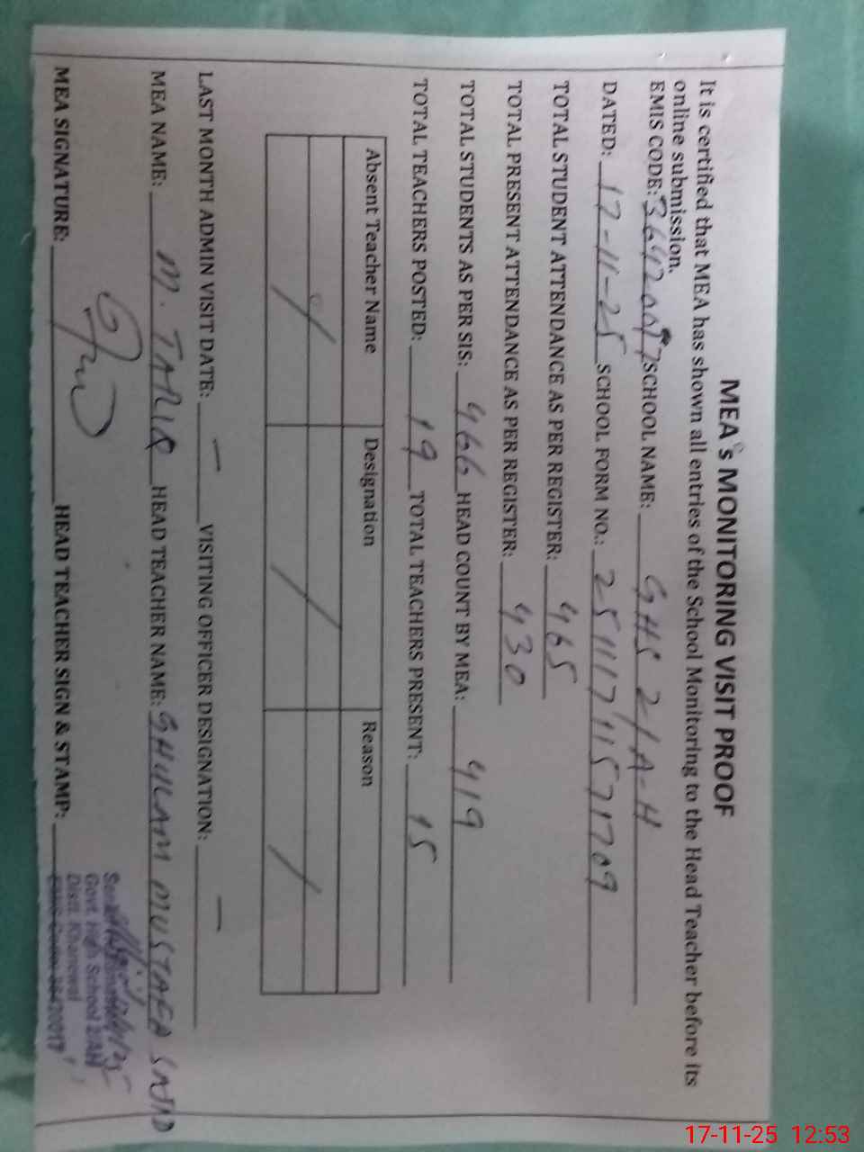 | Attendance Register | Head Teacher | MEA with School | Visit Proof |