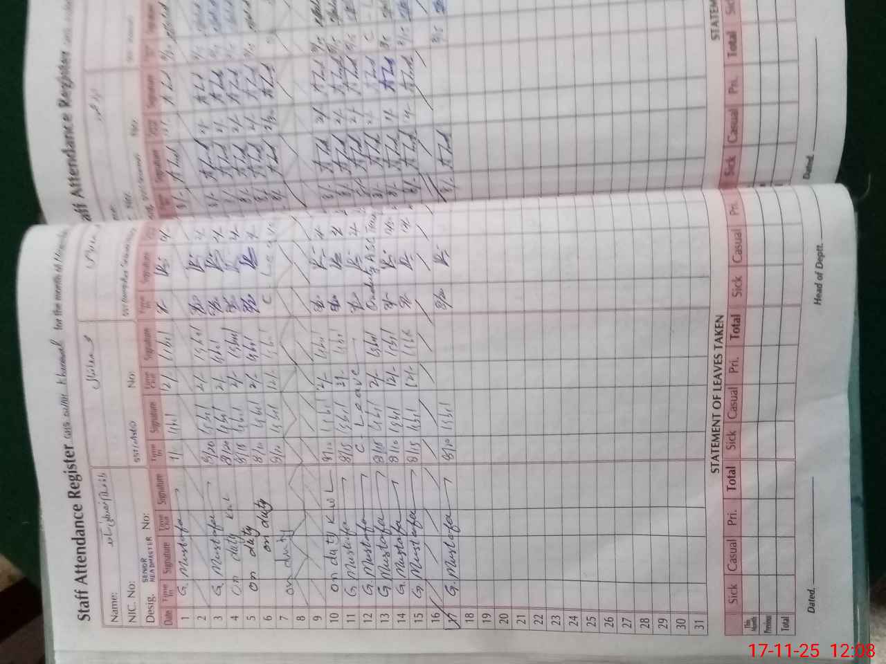 | CNIC | Full Name | Designation | R/C | Absence During Last Calender Month |