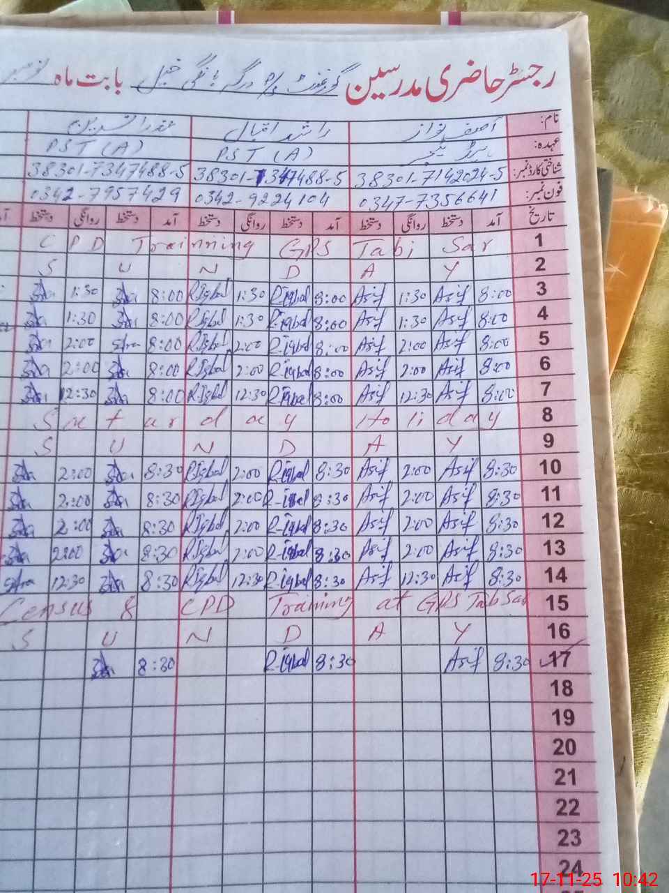 | Total no. of Classrooms: 4 No. of Classrooms Used for Teaching: 4 No. of Classrooms Storing Old Furniture, FTBs, etc: 0Comments if Any: 7th class All students were present on 14th November according to the attendance register of the afternoon shift students attendance register |